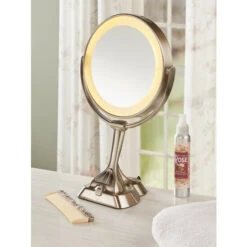 This vanity mirror is designed with ultra-bright LED lighting that illuminates your entire face and stays cool to the touch. The mirror features a surround-light design and dual magnification: 10X for details and touch-ups and 1X for a clear view of the entire face. It’s also fully height and angle adjustable for easy viewing, and it has an infinity dimming pad on the base so you can easily soften and brighten the lighting level. With its satin nickel finish, this mirror adds a glamorous touch to your vanity/bathroom countertop.